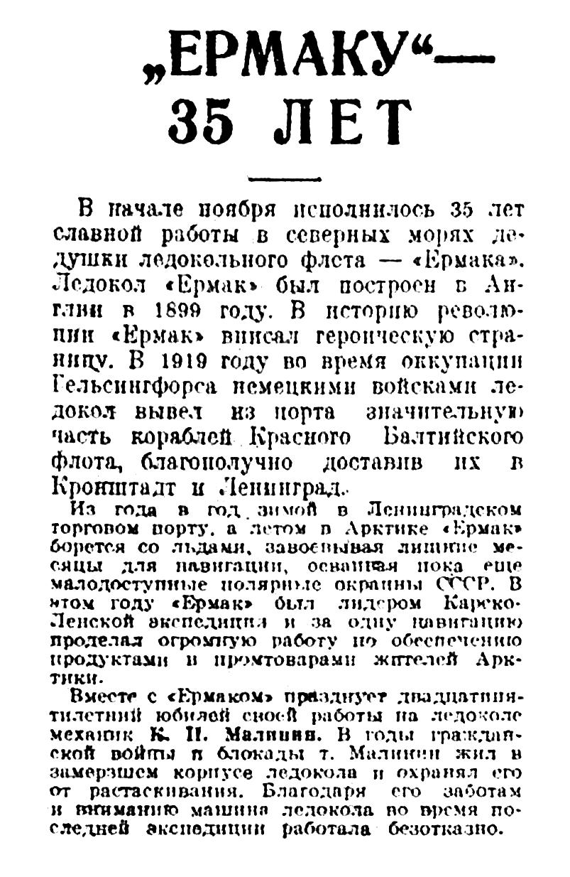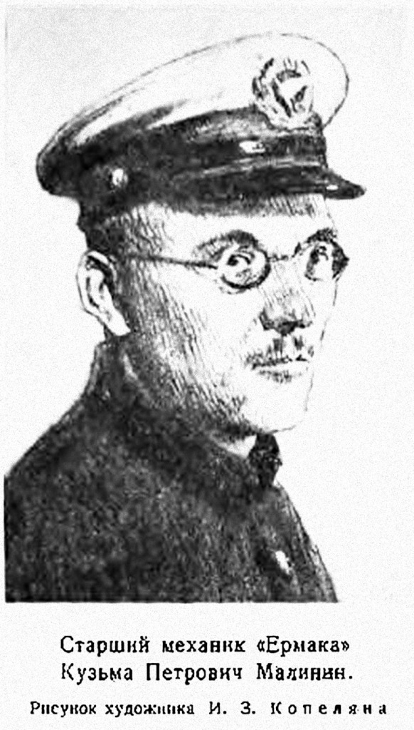 Судьба «Ермака» во многом стала судьбой самого К. П. Малинина. Здесь раскрылось дарование талантливого рационализатора и активного общественника. По предложению Кузьмы Петровича в 1924 г. на ледоколе был установлен новый гребной винт, что дало экономию в 41 500 рублей. В декабре того же года, когда «Ермак», разворачиваясь в Ленинградском порту, сломал винт, К. П. Малинин разработал новую методику ремонта без захода в док. Осуществленная впервые в мировой практике, эта операция дала значительную экономию времени и средств и позволила существенно продлить навигацию.