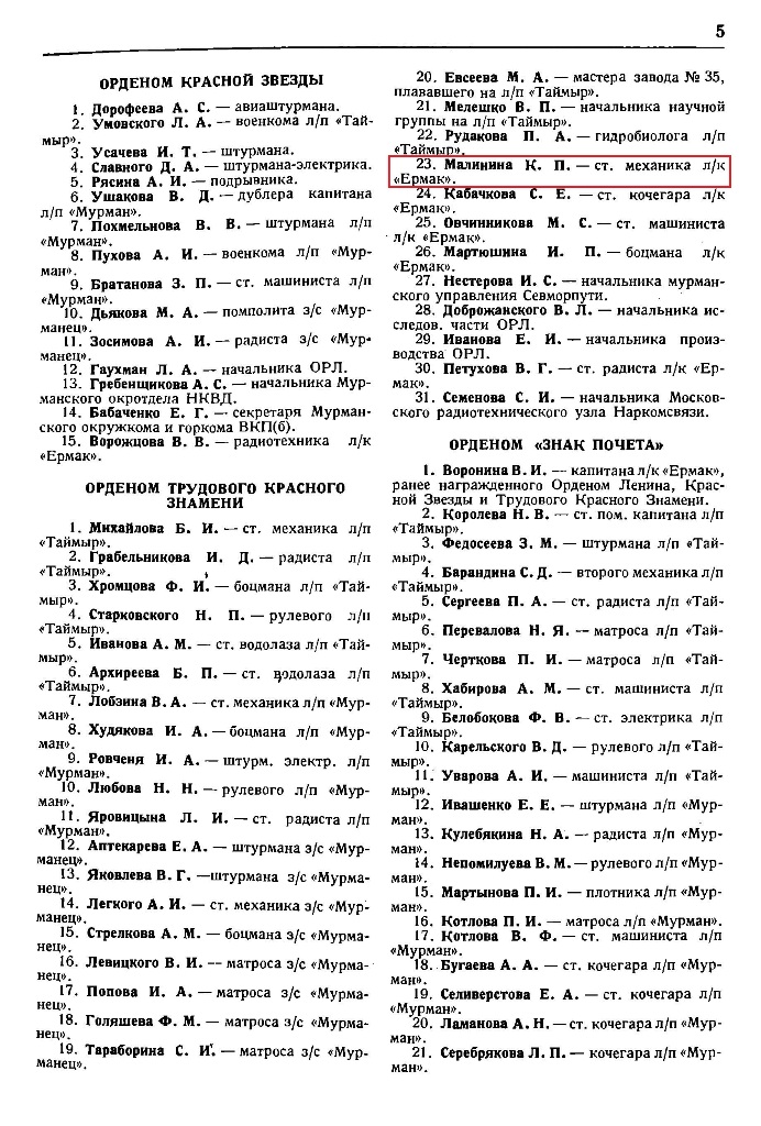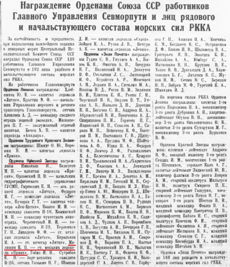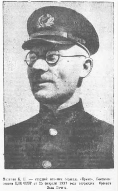 С 1934 г. в составе экипажа ледокола «Ермак» Малинин работал на трассе Северного морского пути. Был одним из первых на флоте стахановцев. В феврале 1937 г. ЦИК СССР «за настойчивость и преданность при выполнении важнейшего задания в северных морях» наградил К. П. Малинина орденом Красной Звезды. Вторую награду — орден Трудового Красного Знамени —Кузьма Петрович получил через год «за отличное выполнение правительственного задания о снятии персонала дрейфующей станции „Северный полюс"». В 1939 г. к этим наградам прибавилась еще одна — значок «Почетный полярник».
