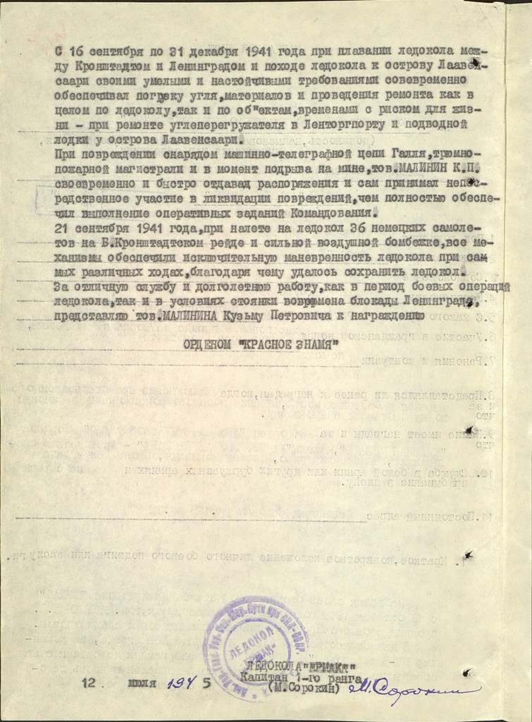 В годы Великой Отечественной войны Кузьма Петрович Малинин находился в осажденном Ленинграде, продолжая нести вахту на ледоколе «Ермак». Здесь же в апреле 1942 г. он вступил в партию.