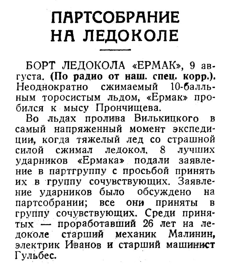 Во льдах пролива Вилькицкого в самый напряженный момент экспедиции, когда тяжелый лед со страшной силой сжимал ледокол. 8 лучших ударников «Ермака» подали заявление в партгруппу с просьбой принять их в группу сочувствующих. Заявление ударников было обсуждено на партсобрании; все они приняты в группу сочувствующих. Среди принятых — проработавший 26 лет на ледоколе старший механик Малинин, электрик Иванов и старший машинист Гульбес.