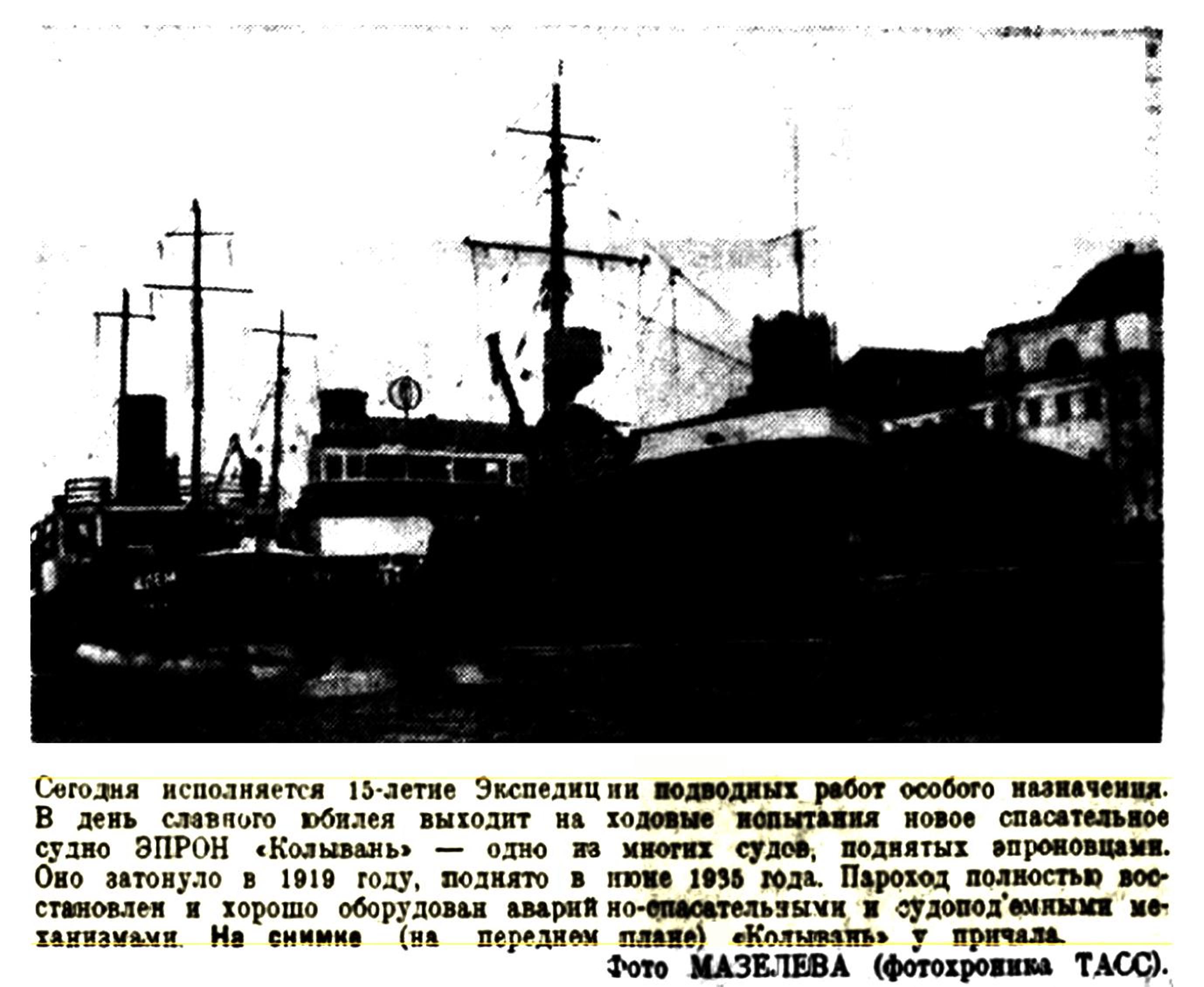 Бывшее китобойное промыслово-обрабатывающее судно "Tulla". Приобретено Морведом 26.10.1913 г. в качестве портового судна "Колывань" для строящейся Ревельской крепости. В феврале 1918 г. совершило переход из Ревеля в Гельсингфорс, а в апреле 1918 г. — в Кронштадт. 10.08.1918 г. подорвалось на мине в Финском заливе и затонуло. Поднято в 1936 1935 г., прошло капитально-восстановительный ремонт и переоборудование. В 1939 г. вошло в состав Балтийской партии ЭПРОН в качестве спасательного судна. 23.06.1941 г. мобилизовано и включено в состав АСС КБФ. Участвовало в перебазировании флота из Таллинна в Кронштадт, шло в конвое № 3. Погибло 28.08.1941 г. от подрыва на мине у м. Юминда. Водоизмещение 950 т. Размерения 49.5 х 8.6 х 4.3 м. ГЭУ котломашинная, 550 л.с. Скорость 8 узлов. Оборудование: шахта под днищем для спуска водолаза при волнении, рекомпрессионная камера, установка для подводной сварки и резки.
