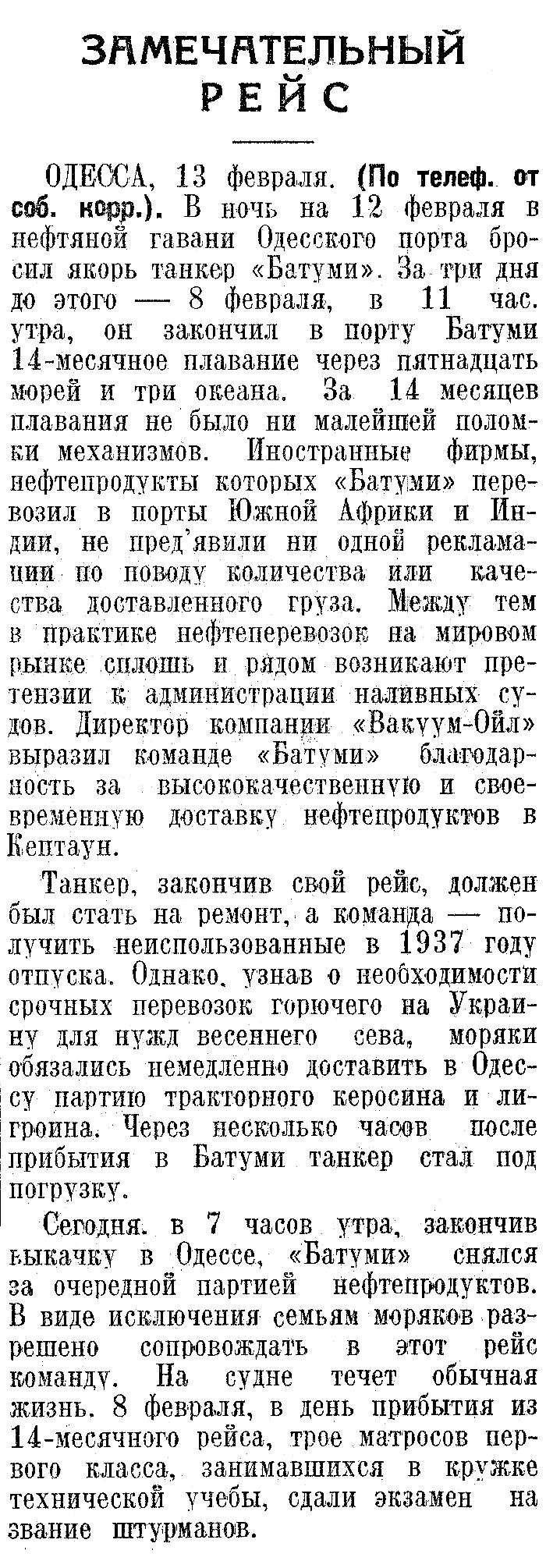 ОДЕССА, 13 февраля. (По телеф. от соб. корр.). В ночь на 12 февраля в нефтяной гавани Одесского порта бросил якорь танкер «Батуми». За три дня до этого — 8 февраля, в 11 час. утра, он закончил в порту Батуми 14-месячное плавание через пятнадцать морей и три океана. За 14 месяцев плавания не было ни малейшей поломки механизмов. Иностранный фирмы, нефтепродукты которых «Батуми» перевозил в порты Южной Африки и Индии, не предъявили ни одной рекламации по поводу количества или качества доставленного груза. Между тем в практике нефтеперевозок на мировом рынке сплошь и рядом возникают претензии к администрации наливных судов. Директор компании «Вакуум-Ойл» выразил команде «Батуми» благодарность за высококачественную и своевременную доставку нефтепродуктов в Кейптаун.