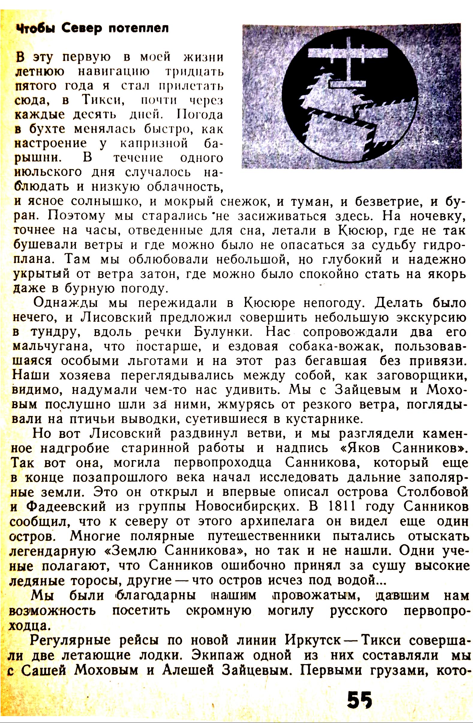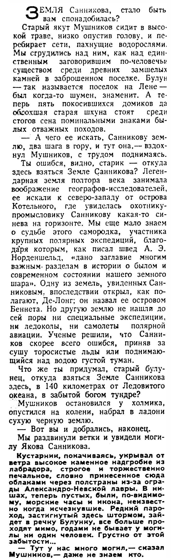 "Однажды мы пережидали в Кюсюре непогоду. Делать было нечего, и Лисовский предложил совершить небольшую экскурсию в тундру, вдоль речки Булунки. Нас сопровождали два его мальчугана и ездовая собака-вожак, пользовавшаяся особыми льготами и на этот раз бегавшая без привязи. Наши хозяева переглядывались между собой как заговорщики, видимо, надумали чем-то нас удивить. Мы с Зайцевым и Моховым (бортмеханик и радист) послушно шли за ними, жмурясь от резкого ветра, поглядывали на птичьи выводки, суетившиеся в кустарнике. Но вот Лисовский раздвинул ветви, и мы разглядели каменное надгробие старинной работы и надпись "Яков Санников". Так вот она, могила первопроходца Санникова, который еще в конце позапрошлого века начал исследовать дальние заполярные земли. Это он открыл и впервые описал острова Столбовой и Фаддеевский из группы Новосибирских. В 1811 году Санников сообщил, что к северу от этого архипелага он видел еще один остров. Многие полярные путешественники пытались отыскать легендарную землю Санникова, но так и не нашли. Одни ученые полагают, что Санников принял за сушу высокие ледяные торосы, другие - что остров исчез под водой...