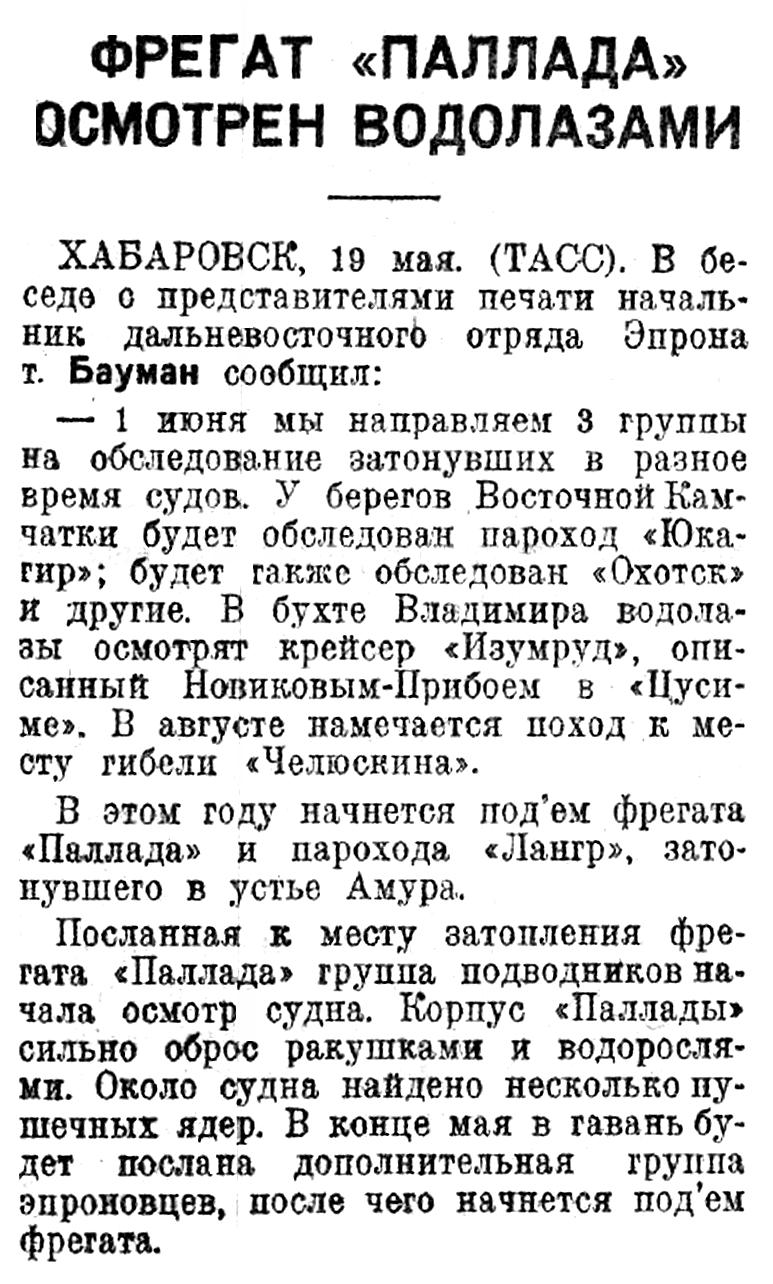 — 1 июня мы направляем 3 группы на обследование затонувших в разное время судов. У берегов Восточной Камчатки будет обследован пароход «Юкагир»; будет также обследован «Охотск» и другие. В бухте Владимира водолазы осмотрят крейсер «Изумруд», описанный Новиковым-Прибоем в «Цусиме». В августе намечается поход к месту гибели «Челюскина».