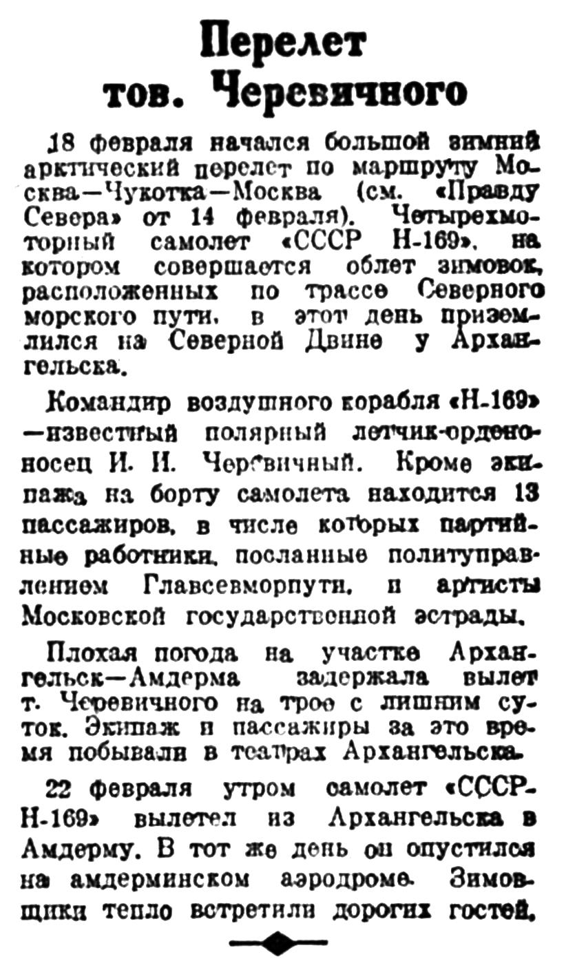 Вчера закончен большой арктический перелет известного полярного летчика-орденоносца И. И. Черевичного по маршруту Москва — Чукотка — Москва. 4 мая четырехмоторный самолет полярной авиации Главсевморпути «Н-169» стартовал из Амдермы и поздно вечером приземлился в Архангельском аэропорту. Вчера после полудня тов. Черевичный покинул Архангельск и после 6 часов полета опустился в Москве.