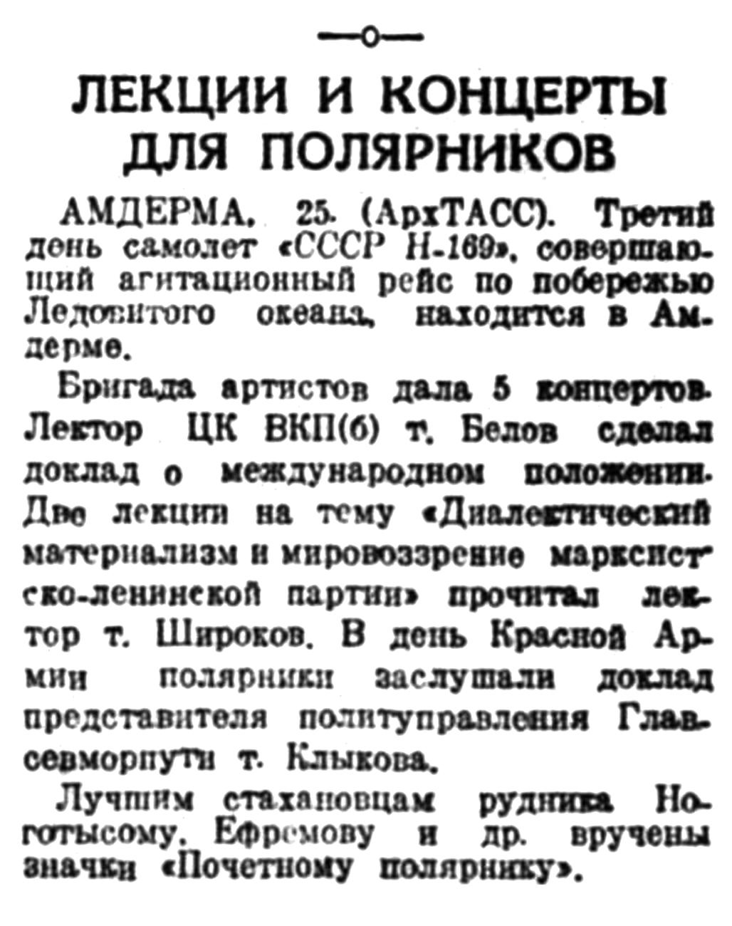 В Анадырском клубе прилетевший на самолете "СССР Н-169" лектор Управления пропаганды и агитации ЦК ВКП(б) тов. Белов сделал доклад о международном положении. Затем бригада московских артистов в составе тт. Балашова, Давыдова, Орленевой, Бажанова дала концерт, который транслировался по радио.
