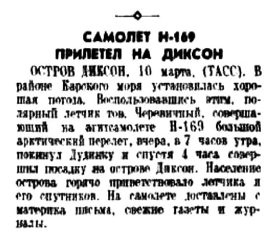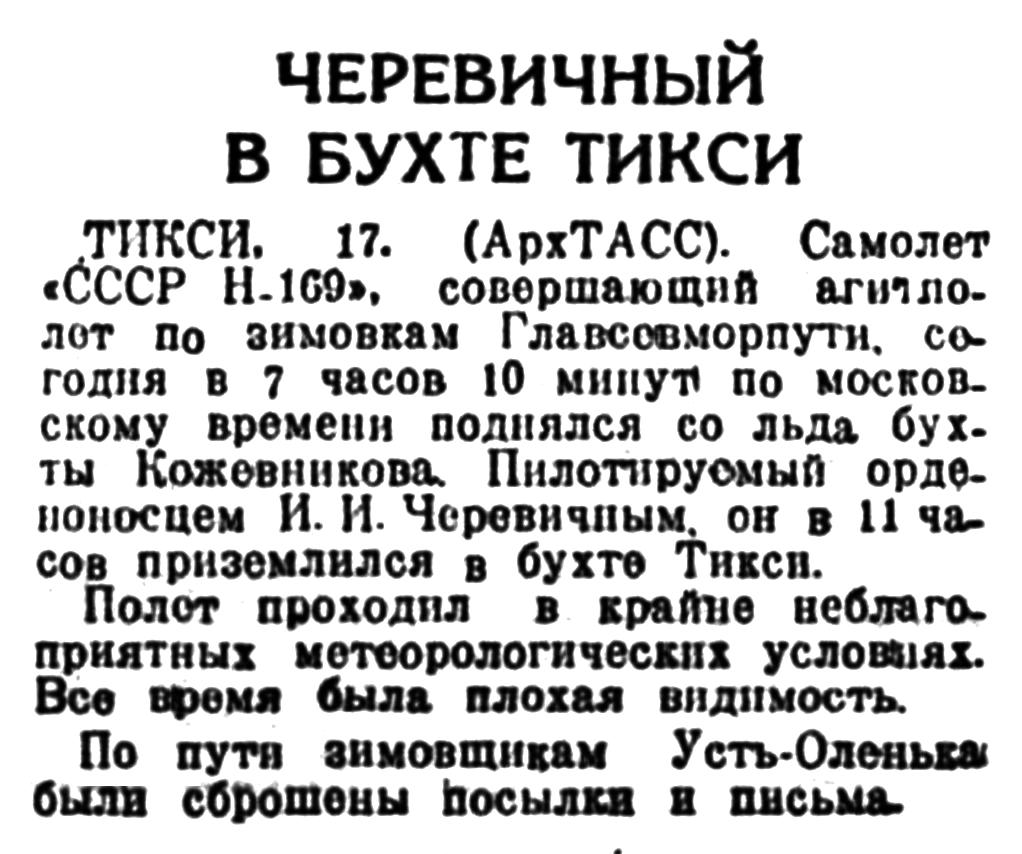 ТИКСИ. 17. (АрхТАСС). Самолет «СССР Н-169», совершающий агитполет по зимовкам Главсевморпути, сегодня в 7 часов 10 минут по московскому времени поднялся со льда бухты Кожевникова. Пилотируемый орденоносцем И. И. Черевичным, он в 11 часов приземлился в бухте Тикси.