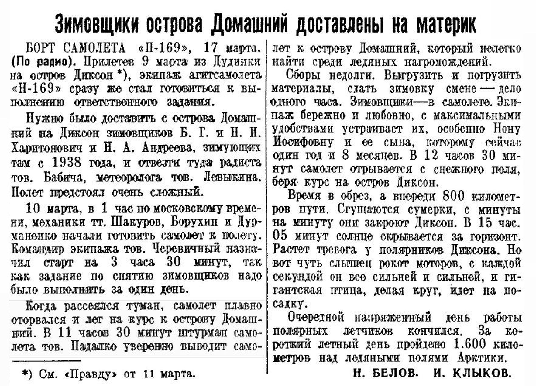 Рейс самолета Н-169 на остров Домашний. Прилетевший на остров Диксон агитсамолет Н-169 10 марта под управлением летчика тов. Черевичного вылетел на остров Домашний (в Карском море), чтобы доставить смену находящимся там полярникам.