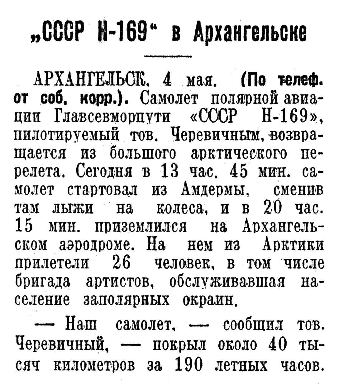 АРХАНГЕЛЬСК. 4 мая. (По телеф. от соб. корр.). Самолет полярной авиации Главсевморпути «СССР Н-169», пилотируемый тов. Черевичным, возвращается из большого арктического перелета. Сегодня в 13 час. 45 мин. самолет стартовал из Амдермы, сменив там лыжи на колеса, и в 20 час. 15 мин. приземлился на Архангельском аэродроме. На нем из Арктики прилетели 26 человек, в том числе бригада артистов, обслуживавшая население заполярных окраин.