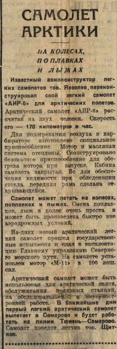 В октябре 1934-го появилось сообщение о готовности первой арктической машины. Говорилось, что через несколько дней самолет прибудет в Москву, его установят на поплавки и испытают на Москве-реке. Перед отправкой в Арктику самолет утеплят и специально переоборудуют для работы в северных условиях. Будет обеспечена бесперебойная работа мотора М-11 при низких температурах. Создатели самолета А.С.Яковлев, С.Д.Трефилов, А.И.Широков. АИР-6 "реконструирован" в ознаменование челюскинской эпопеи. В феврале 1935-го самолет прошел госиспытания и был передан в Главное управление Севморпути. В этом же месяце пилот Щитков вылетел в Тюмень для обслуживания обской линии Тюмень - Самарово (Ханты-Мансийск). С марта 1935-го здесь работали три АИР-6.