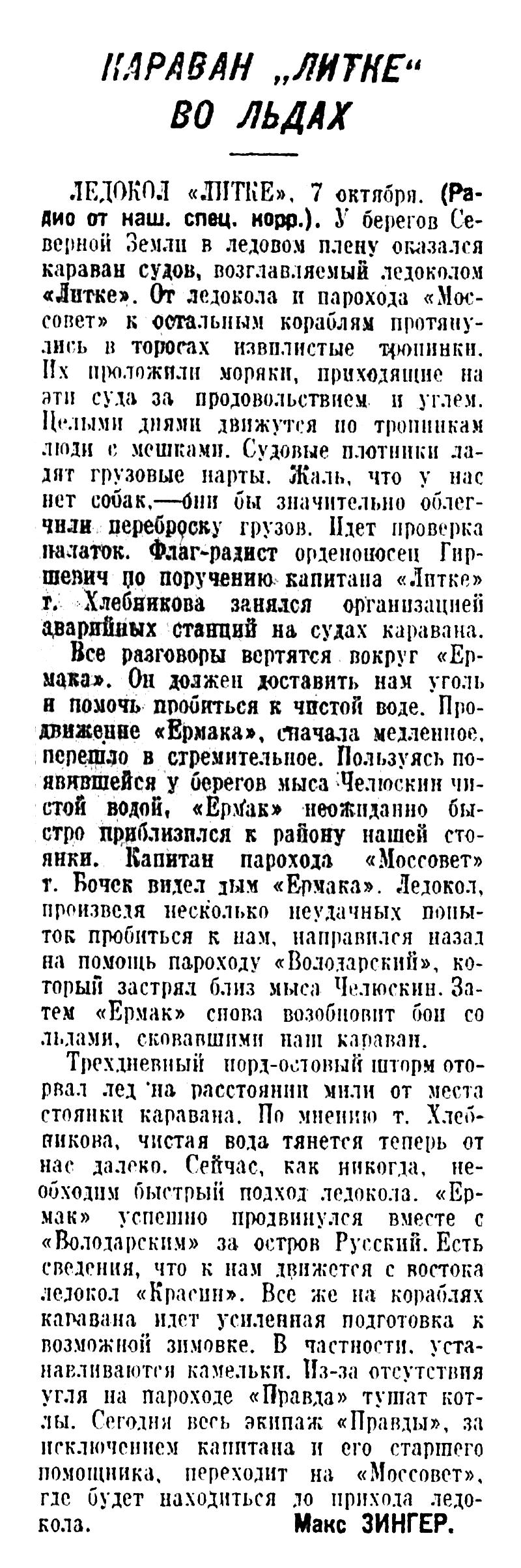 ЛЕДОКОЛ «ЛИТКЕ», 7 октября. (Радио от наш. спец. корр.). У берегов Северной Земли в ледовом плену оказался караван судов, возглавляемый ледоколом «Литке». От ледокола и парохода «Моссовет» к остальным кораблям протянулись в торосах извилистые тропинки. Их проложили моряки, приходящие на эти суда за продовольствием и углем. Целыми днями движутся по тропинкам люди с мешками. Судовые плотники ладят грузовые нарты. Жаль, что у нас нет собак, — Они бы значительно облегчили переброску грузов. Идет проверка палаток. Флаг-радист орденоносец Гиршевич по поручению капитана «Литке» т. Хлебникова занялся организацией аварийных станций на судах каравана.