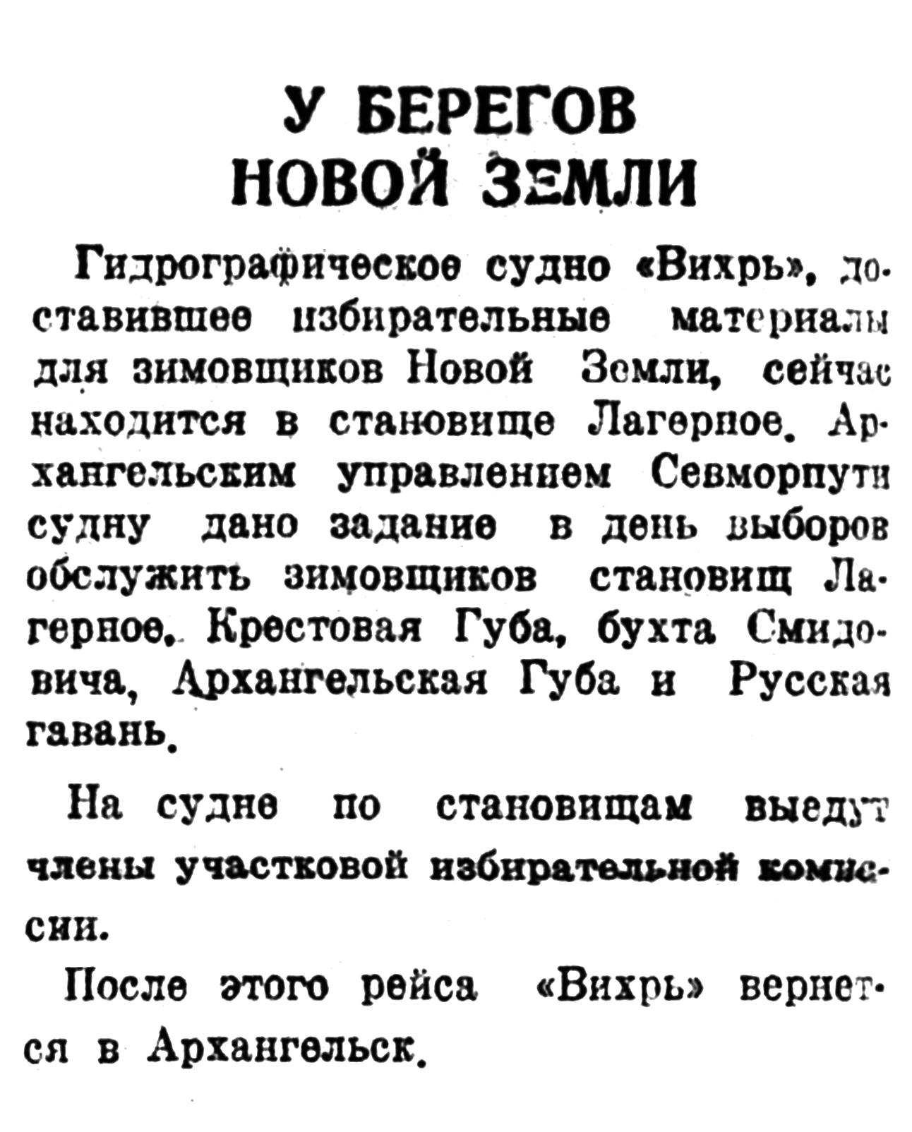 На Новую Землю из Архангельска прибыл гидрографический бот «Вихрь». Это первое в текущей арктической навигации судно. Кроме избирательной литературы, почты и материалов для полярных станций, на борту судна находятся избирательные бюллетени с именем кандидата в депутаты Верховного Совета РСФСР по Архангельскому-Приморскому избирательному округу Т. 3. Тарасова.