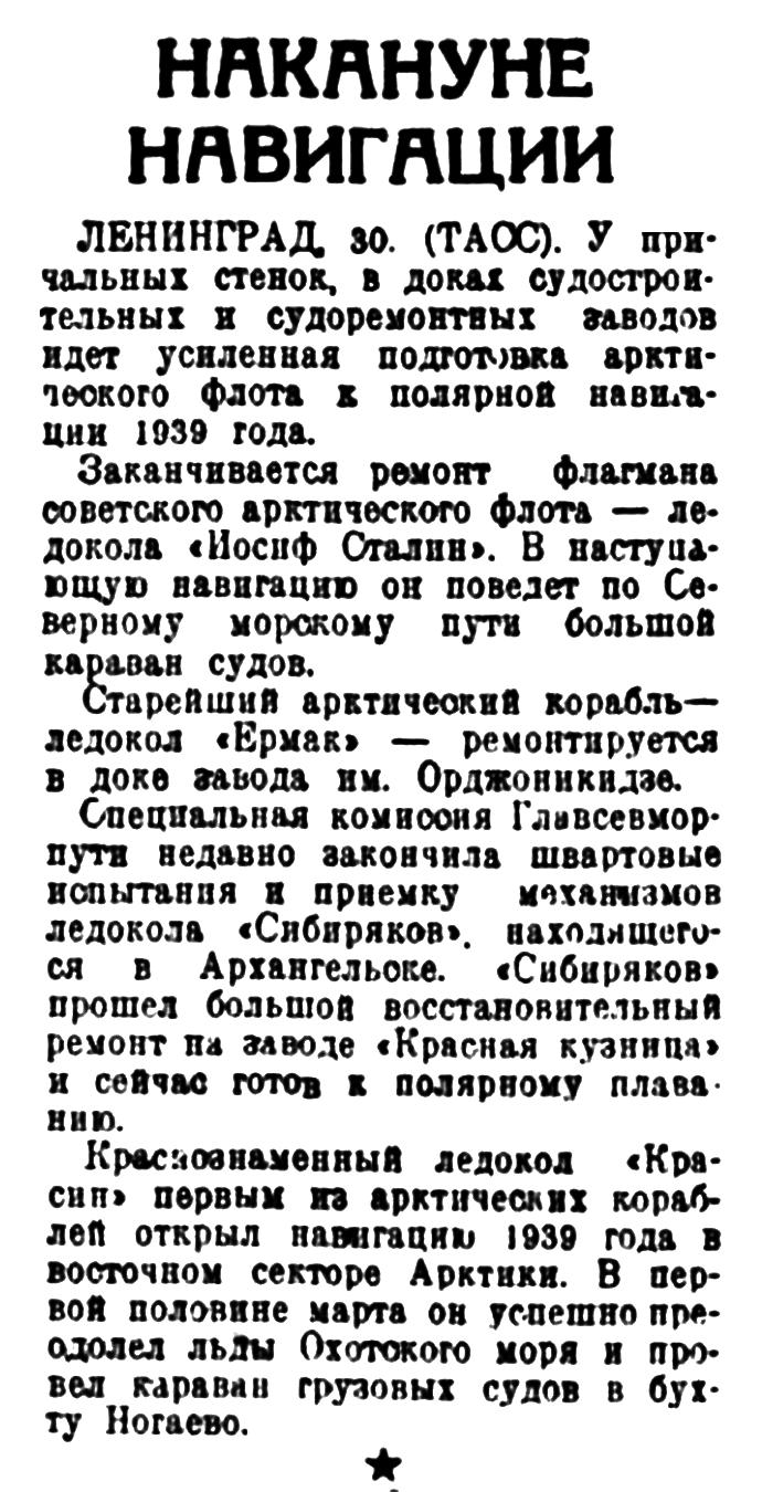 ЛЕНИНГРАД 30. (ТАСС). У причальных стенок, в доках судостроительных и судоремонтных заводов идет усиленная подготовка арктического флота к полярной навигации 1939 года.