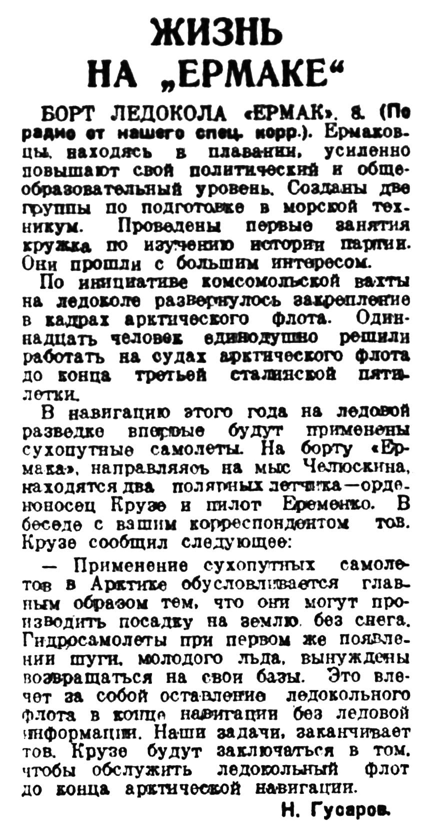 БОРТ ЛЕДОКОЛА «ЕРМАК». 8. (По радио от нашего спец. корр.). Ермаковцы, находясь в плававши, усиленно повышают свой политический и общеобразовательный уровень. Созданы две группы по подготовке в морской техникум. Проведены первые занятая кружка по изучению истории партии. Они прошли с большим интересом.
