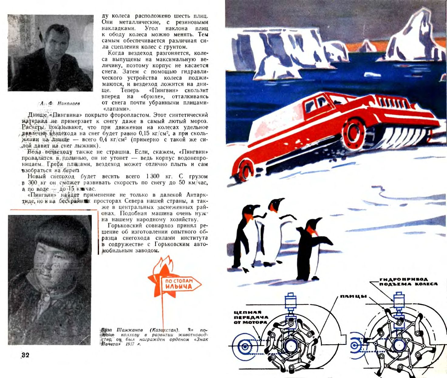 Природа не раз подсказывала изобретателям и конструкторам решения различных технических задач. Вспомните крыло самолета, шагающий экскаватор, прыгающий автомобиль (см. «ЮТ» № 11 за 1961 год). Доцент Горьковского политехнического института Аркадий Федорович Николаев, проектируя новый вездеход, решил использовать принцип движения пингвина.