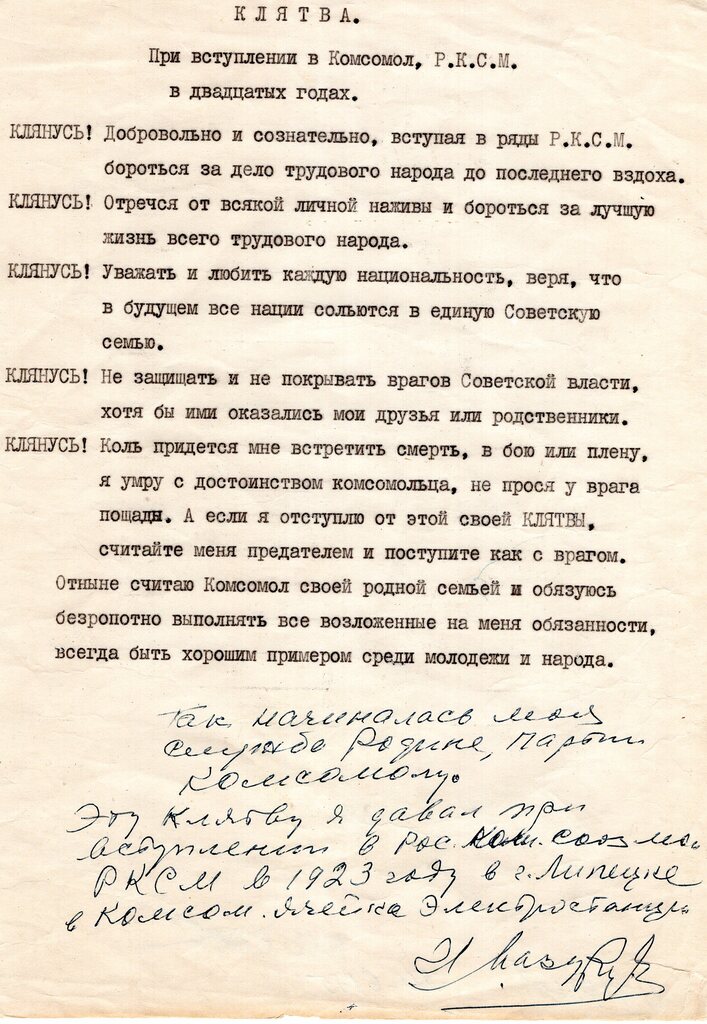 Клятва при вступлении в комсомол (РКСМ) И.П.Мазурука от 1923 г. c личным автографом Героя. // Из фондов ОБУК "Липецкий областной краеведческий музей".