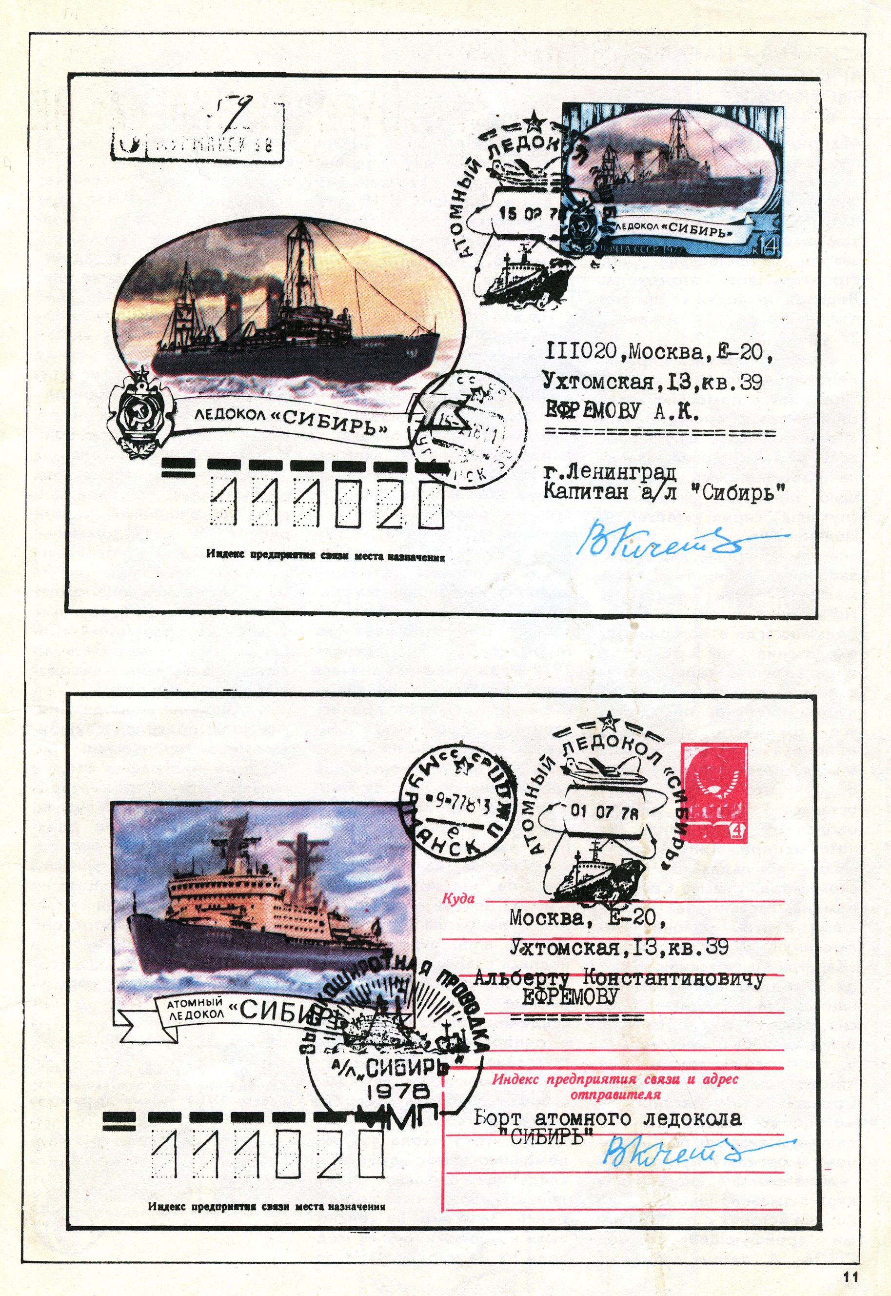 У «Сибири» впереди многие годы полярной службы. Однако героическое начало ее биографии это не только первая трасса, проложенная в высоких широтах, это и почтовые документы. А в историю покорения Арктики будут вписаны имена первопроходцев — атомного ледокола «Сибирь» и дизель-электрохода «Капитан Мышевский».