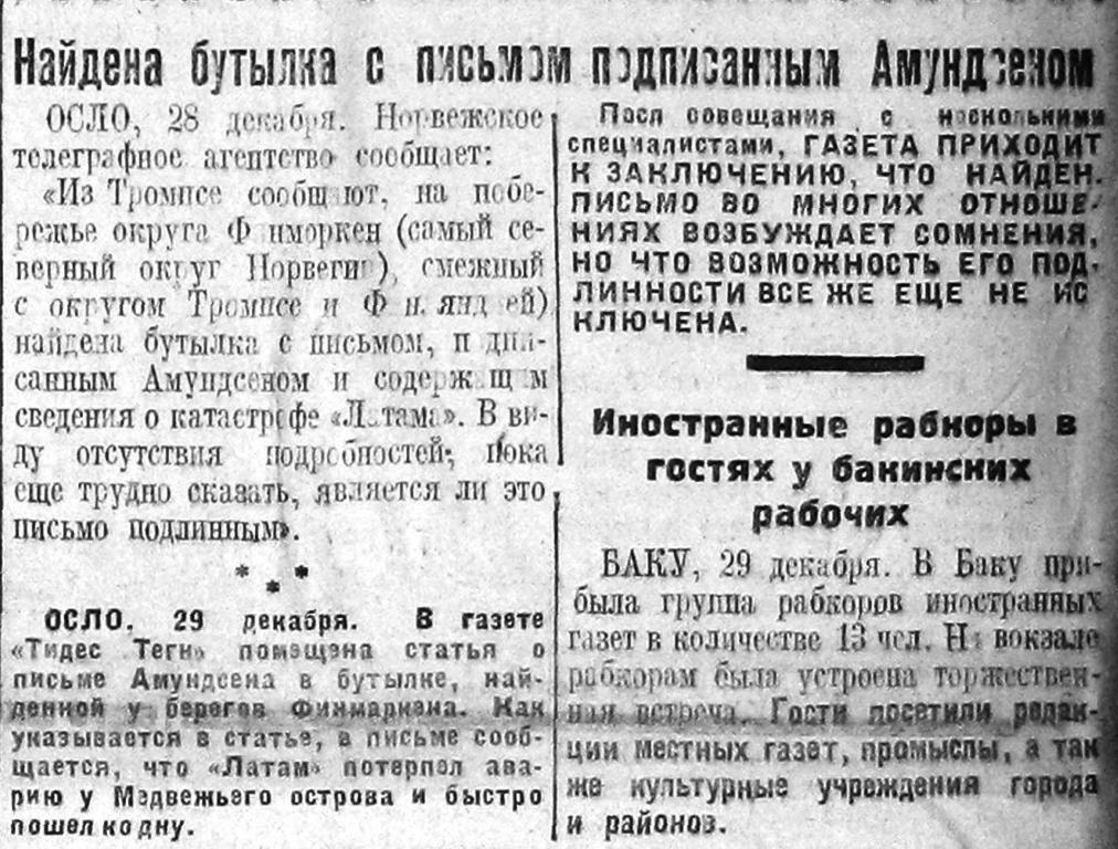«Из Тромпсе сообщают, на побережье округа Финморкен (самый северный округ Норвегии), смежный с округом Тромпсе и Финляндией) найдена бутылка с письмом, подписанным Амундсеном и содержащим сведения о катастрофе "Латама". В виду отсутствия подробностей, пока еще трудно сказать, является ли это письмо подлинным».