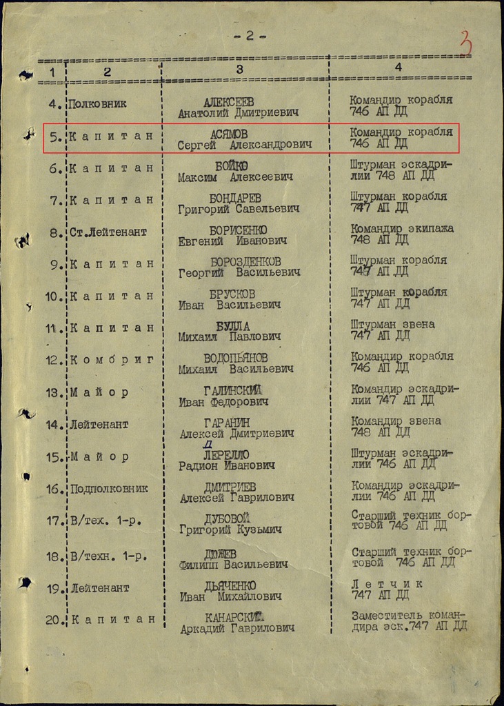 В феврале 1942-го майору С.А. Асямову за успешное выполнение заданий командования, 30 боевых вылетов вручили орден Красного Знамени. Будучи орденоносцем, он ещё не раз водил группы самолётов бомбить железнодорожные узлы Вязьмы и Смоленска, морской порт Данциг. Налёты были результативны, но и смертельная опасность подстерегала наших лётчиков в каждом таком рейсе.