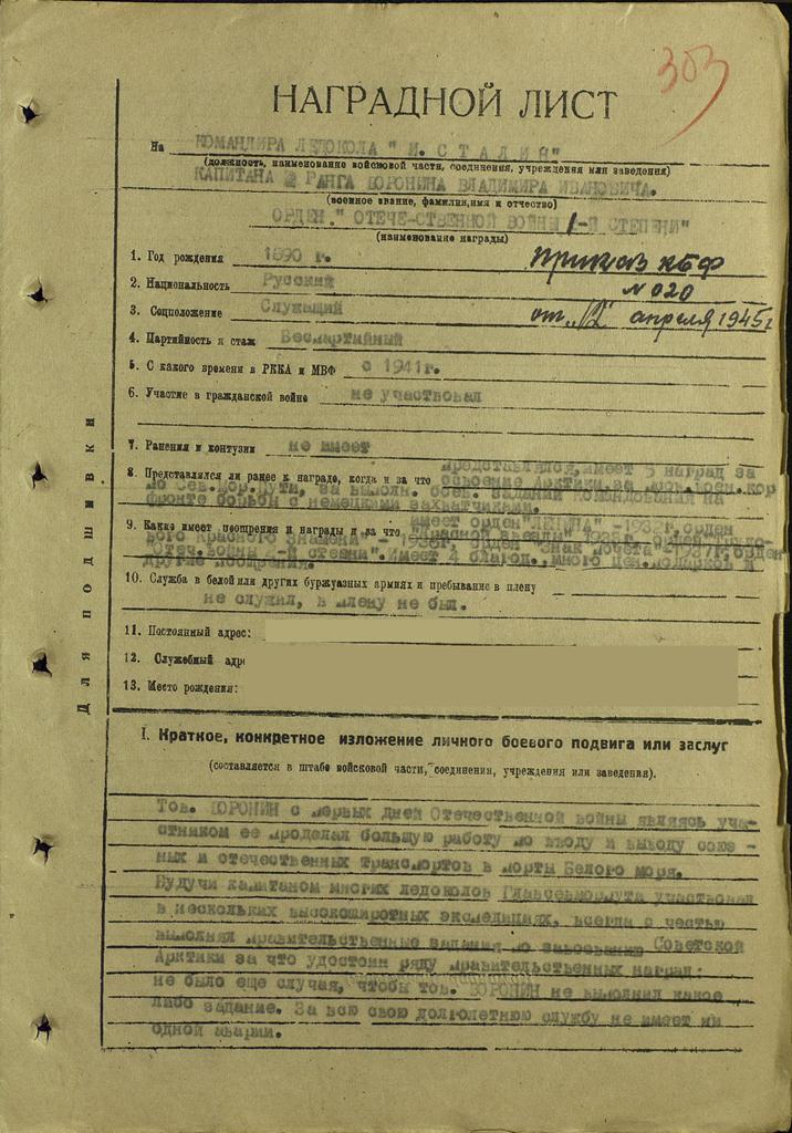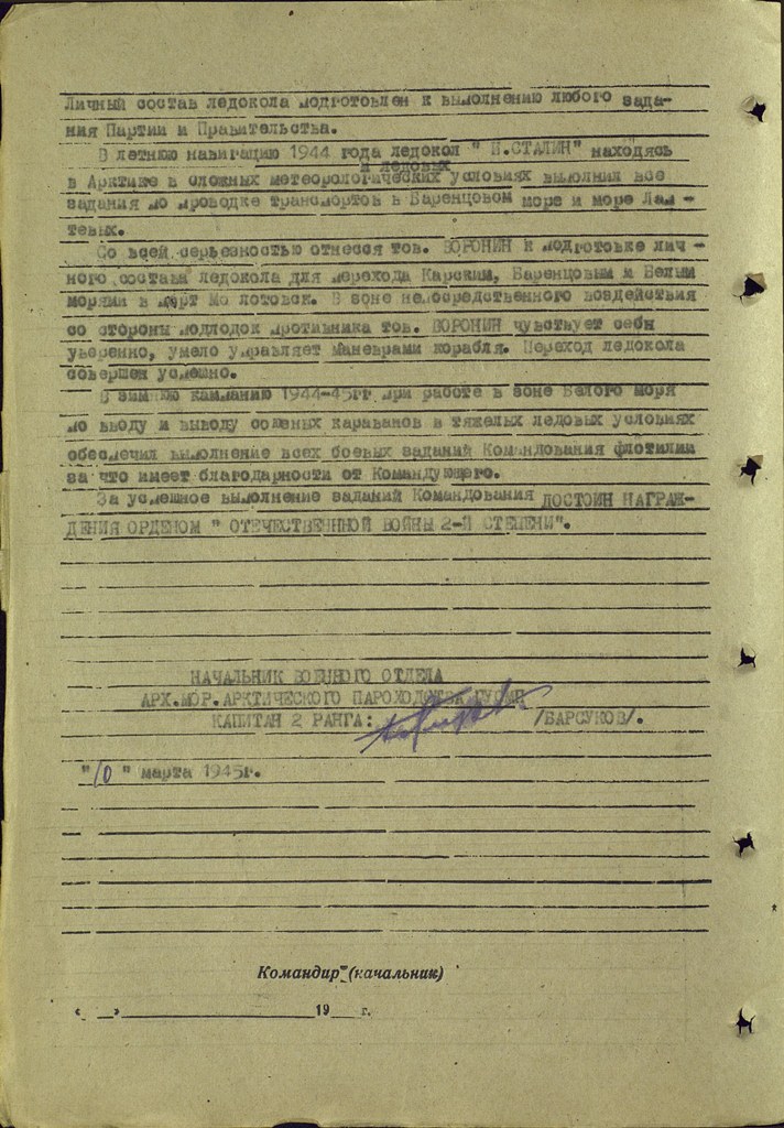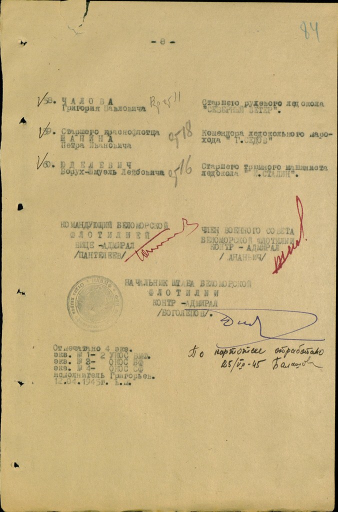 Приказ Командующего БВФ №020 от 12 апреля 1945 г. г. Архангельск.