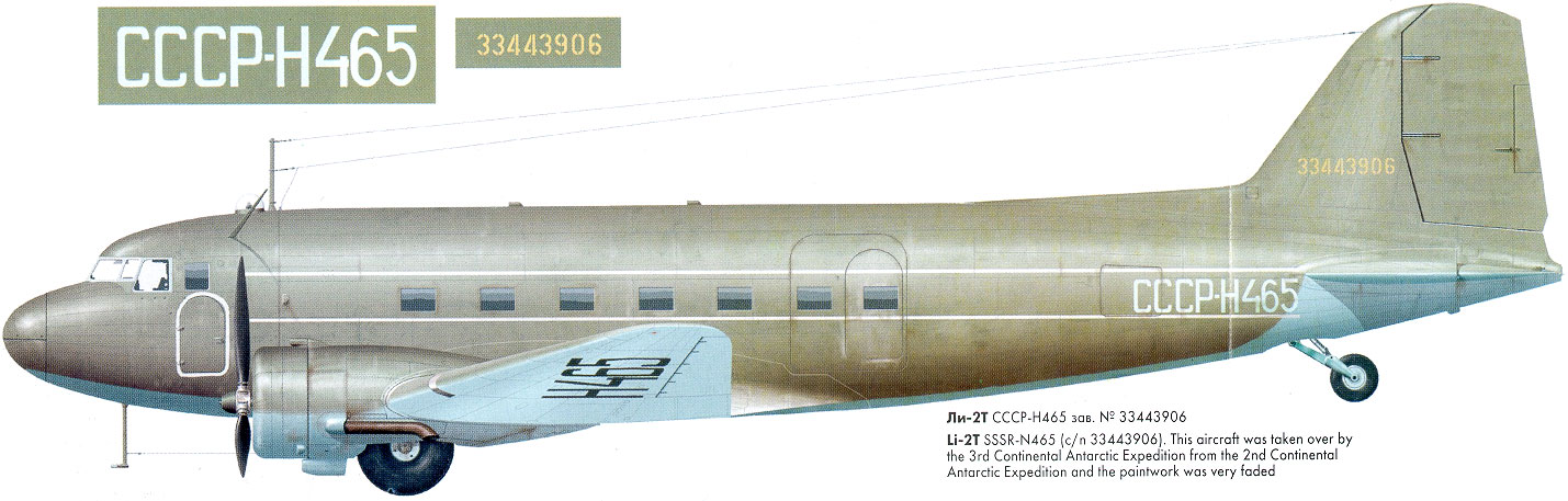 Li-2T 3 34 439 06 CCCP-N465 Polyarnaya Aviatsiya mfd jan53 damaged by hurricane at ice Station Mirny 15aug57 but repaired and converted to Li-2V and possibly re-registered CCCP-04165