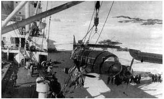 Погрузка самолета и автомашин для Антарктической экспедиции на дизельэлектроход "Обь". Ноябрь, 1956.