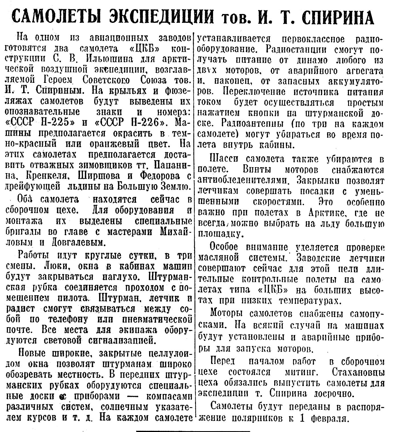 На одном из авиационных заводов готовятся два самолета «ЦКБ» конструкции С. В. Ильюшина для арктической воздушной экспедиции, возглавляемой Героем Советского Союза тов. И. Т. Спириным. На крыльях и фюзеляжах самолетов будут выведены их опознавательные знаки и номера: «СССР Н-225» и «СССР Н-226». Машины предполагается окрасить в темно-красный или оранжевый цвет. На этих самолетах предполагается доставить отважных зимовщиков тт. Папанина, Кренкеля, Ширшова и Федорова с дрейфующей льдины на Большую Землю.