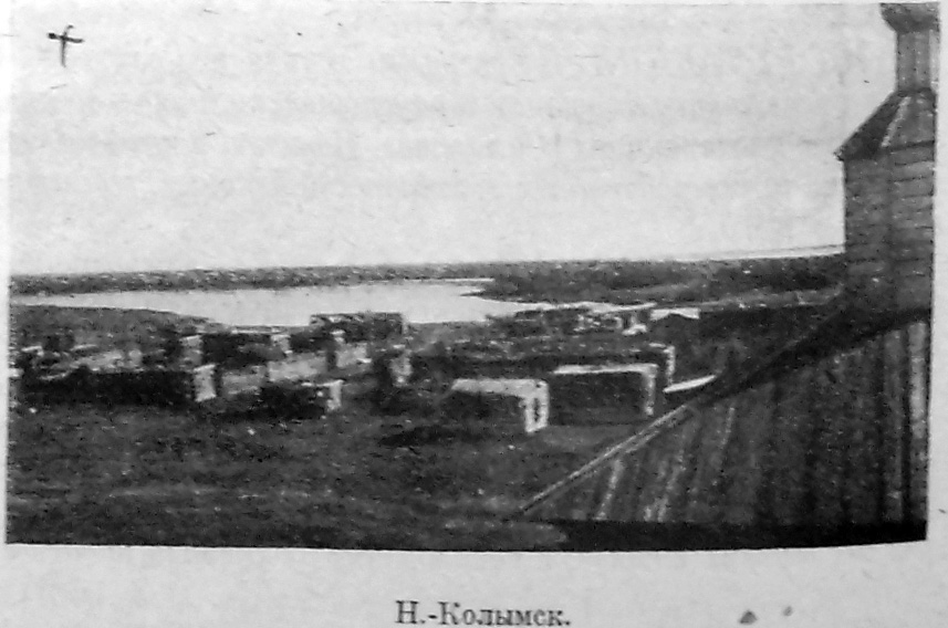Город Нижне-Колымск представляет собою небольшой поселок с радиоприемником. Здесь имеется довольно значительный запас бензина, из которого нами было взято 700 кг, и. кроме того, 2 бочки отправлены, со шхуной в Русское Устье (для снабжения будущих перелетов). В Нижне-Колымске был организован митинг, на котором были освещены задачи нашего перелета и значение авиации на крайнем Севере. Река Колыма течет в низких берегах, поблизости которых разбросано много озер. Стоянки в устье реки Колымы удобны и по рельефу берегов и в смысле устойчивости уровня воды. У города Нижне-Колымска берег отлогий и илистый, что очень неудобно для самолета, не могущего подойти близко к берегу.