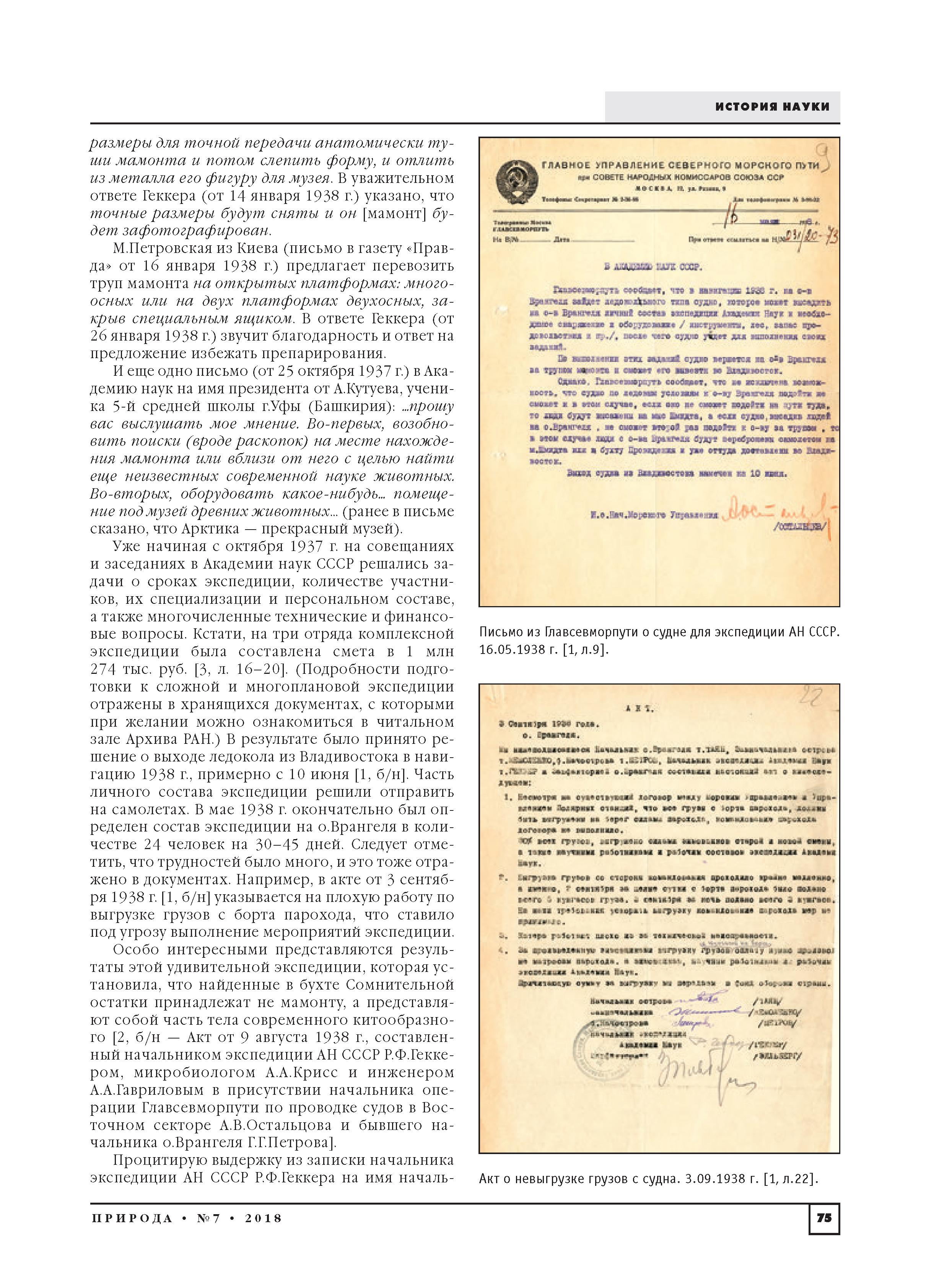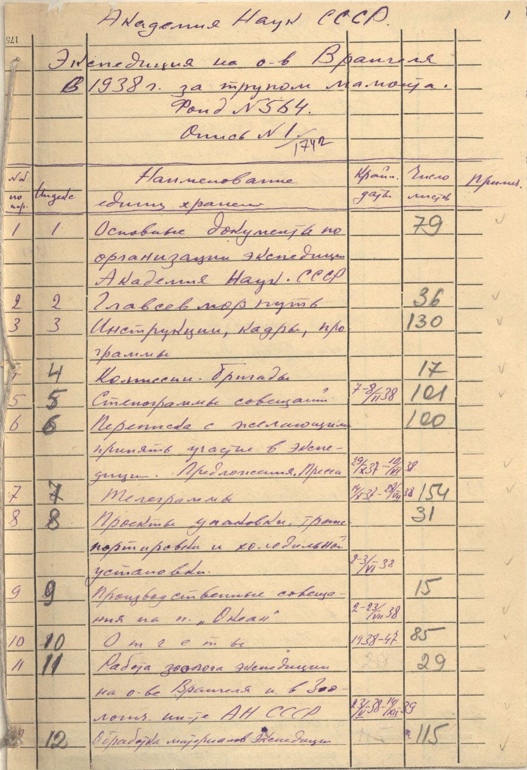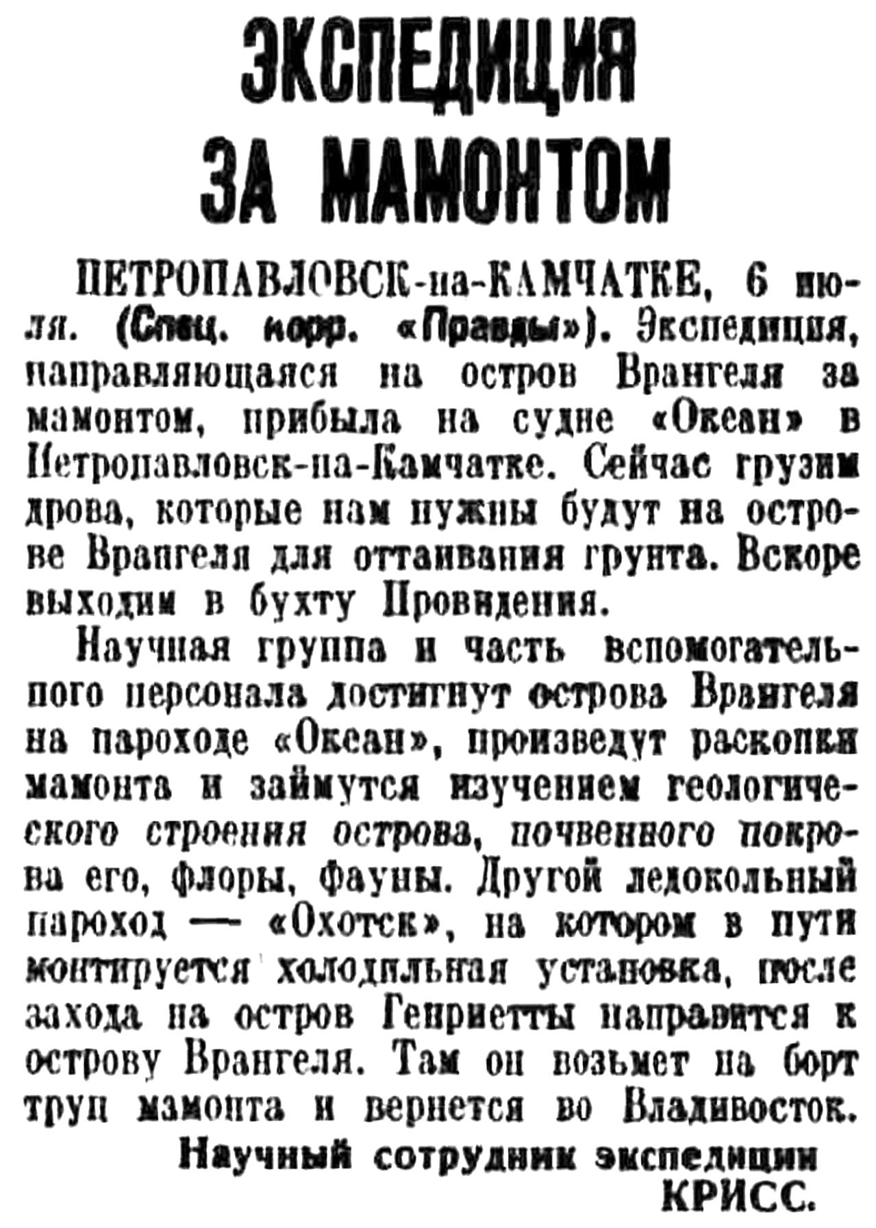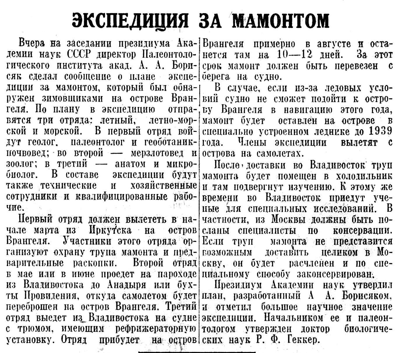 Вчера на заседании президиума Академии наук СССР директор Палеонтологического института акад. А. А. Борисяк сделал сообщение о плане экспедиции за мамонтом, который был обнаружен зимовщиками на острове Врангеля. По плану в экспедицию отправятся три отряда: летный, летно-морской и морской. В первый отряд войдут геолог, палеонтолог и геоботаник-почвовед; во второй — мерзлотовед и зоолог; в третий — анатом и микробиолог. В составе экспедиции будут также технические и хозяйственные сотрудники и квалифицированные рабочие.