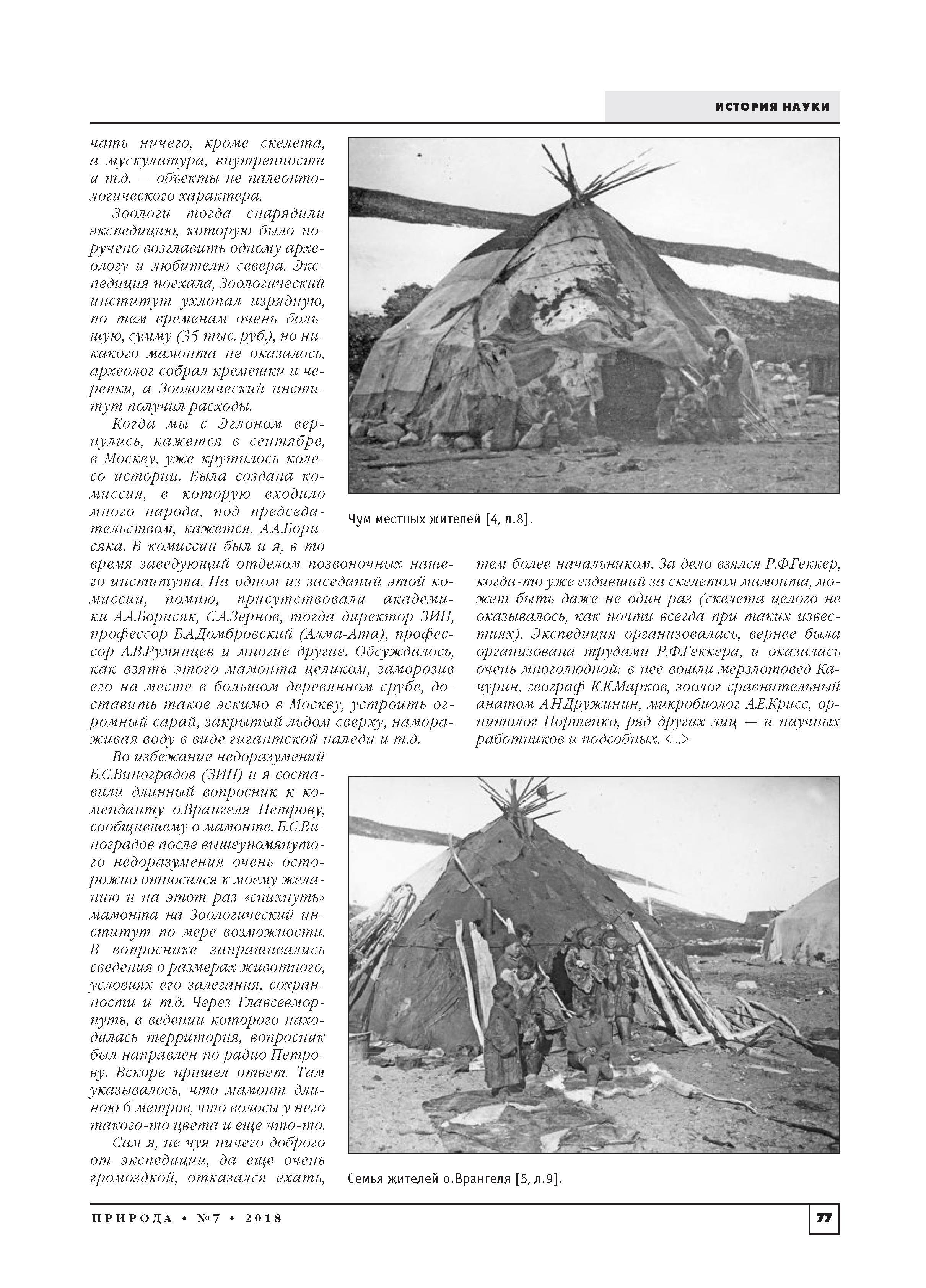 Летом 1937 года я был вместе с Я.М. Эглоном в Закавказье, где мы осматривали некоторые местонахождения ископаемых млекопитающих. В Цители-Цхаро (?Цители-Цхали), бывш. Красный колодец, была поставлена небольшая пробная раскопка на местонахождении гиппарионовой фауны. Однажды Эглон показал мне номер газеты, где сообщалось о находке на острове Врангеля мамонта, в замороженном состоянии, целый мамонт. «Ну, – подумал я – опять начинается, знаем мы этих мамонтов». Мне вспомнились уже бывшие ранее «находки» туш мамонта, когда либо были неполный череп и разрозненные кости, либо, в начале тридцатых годов, оказались остатки вмерзшего в лед кита. Одного такого мамонта в начале моей работы в Палеонтологическом (тогда Палеозоологическом) институте в Ленинграде я уговорил А.А. Борисяка сплавить Зоологическому институту Академии наук, так как в нашем институте мы не в силах изучать ничего кроме скелета, а мускулатура, внутренности и т.д. – объекты не палеонтологического характера. Зоологи тогда снарядили экспедицию, которую было поручено возглавить одному археологу и любителю севера, экспедиция поехала, Зоологический институт ухлопал изрядную сумму, по тем временам очень большую (?35 тысяч рублей), никакого мамонта не оказалось, археолог собрал кремешки и черепки, а Зоологический институт получил расходы.
