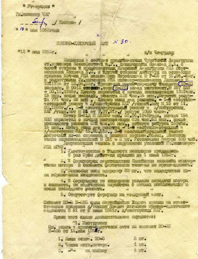 Л. 162-164. Пр. Р-70. …июля 1952г. Об изменении учёта СМП УПА. П.3. Зачислить на б. Чукотской АГ с-ты ПО-2 зав №0013 и №0165, опозн знаки Н-382 и Н-405 и ЛИ-2 зав №18435802 Н-549. … ИО нач УПА Демьянов.