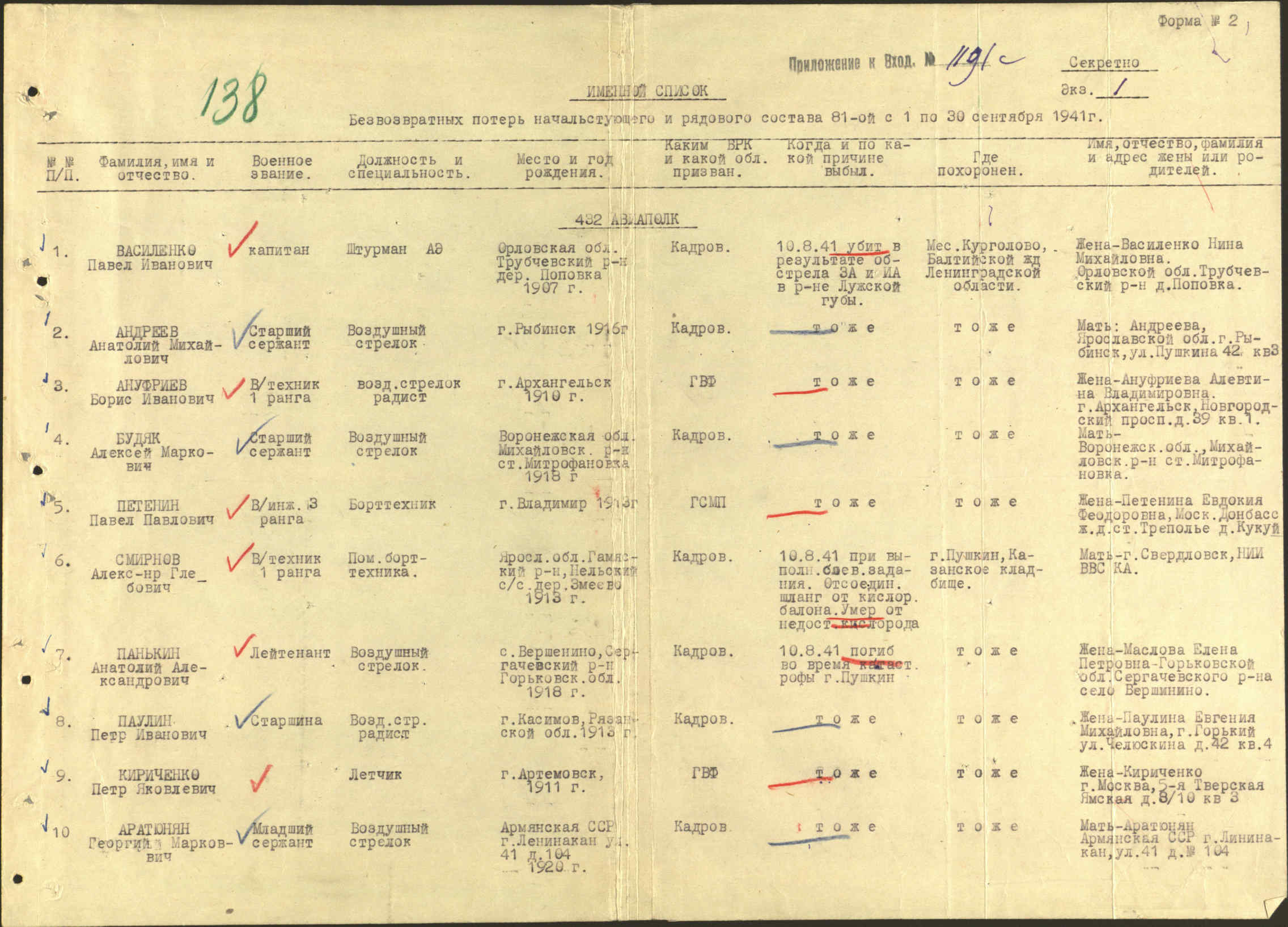 Дата выбытия 10.08.1941