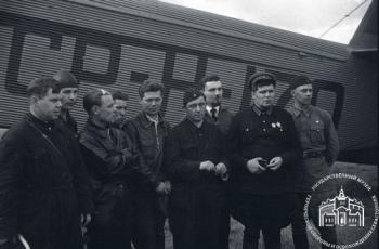 Экипаж флагманского АНТ-6 (Г-2) "Авиаарктика" Н-170 командира отряда М.В.Водопьянова в период ВВЭ "Север" (22 марта-25 июня) 1937 г.: командир - М.В.Водопьянов, второй пилот - М.С.Бабушкин, штурман - флаг-штурман экспедиции И.Т.Спирин, бортрадист - С.А.Иванов, 1-й бортмеханик - Ф.И.Бассейн, 2-й бортмеханик - П.П.Петенин, 3-й бортмеханик - инженер моторостроительного завода № 24 им. М.В.Фрунзе К.Н.Морозов: