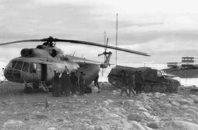 Разгрузка вертолета, прилетевшего с судна с "колониальными товарами".