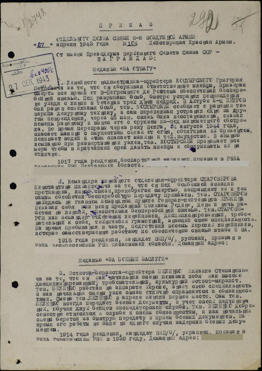 Приказ подразделения №: 104 от: 27.04.1943 опс 8 ВА