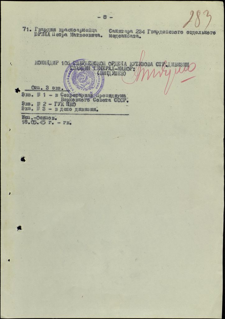 Приказ подразделения №: 17/н от: 18.05.1945 106 гв. сд 9 гв. А