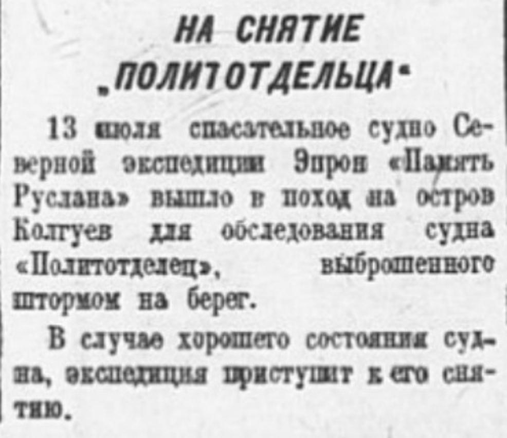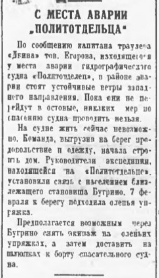 «Политотделец» был деревянной парусно-моторной шхуной типа норвежского зверобоя, общим водоизмещением около 500 тонн, построенной Медвежьегорской верфью на Онежском озере. В машинном отделении стояли двигатель фирмы «Отто Дейц» мощностью 360 сил и множество вспомогательных механизмов — динамо-машина, помпы и прочее. Там же находился и небольшой паровой котел для обогрева помещений, отапливаемый форсункой. Корпус судна имел сплошной набор, пояс толстой дубовой обшивки и ледовое подкрепление. Он был необычайно крепким, и только этому обстоятельству читатель обязан тем, что я могу поделиться с ним своими воспоминаниями. Судно было хорошо приспособлено на случай зимовки в Арктике. Всю кормовую часть его, больше одной трети общей длины, занимала от борта до борта жилая рубка, в ней же помещалась и радиостанция. Наружные стенки рубки были хорошо утепленными, очень толстыми.