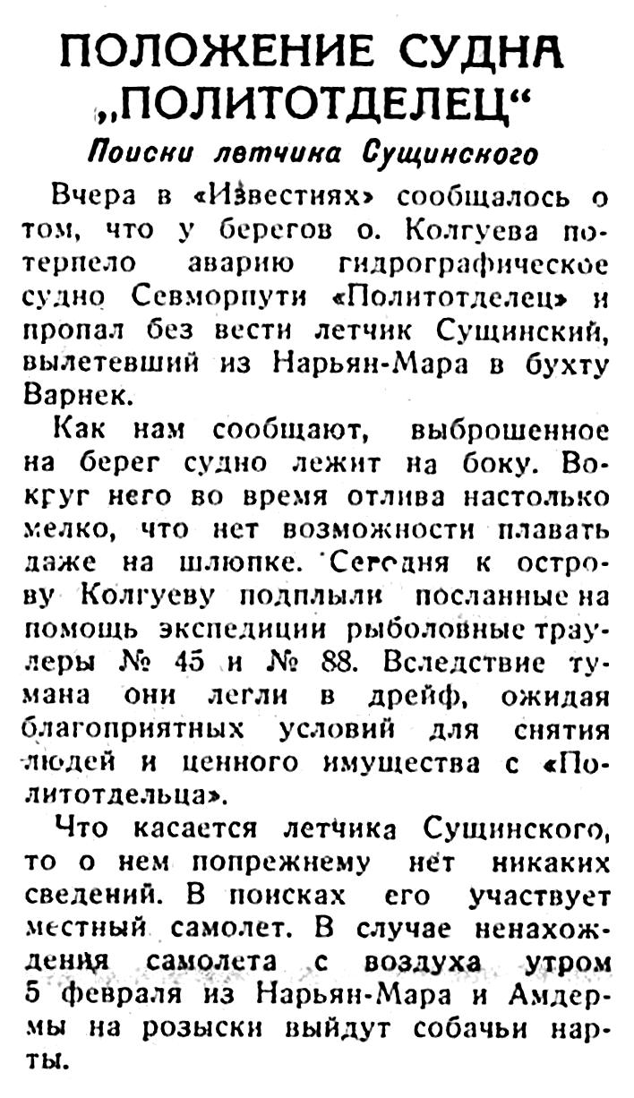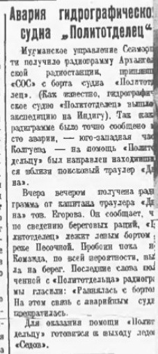 Здесь при любезном содействии Н. И. Евгенова я договорился о фрахте «Политотдельца» и заключил соответствующий договор. По договору Гидрографическое управление обязалось устранить все неполадки на корабле и подготовить его к выходу в море не позднее ноября. Судно было укомплектовано командой, и мне предстояло только подобрать в Москве членов экспедиции. Но это оказалось совсем нелегко: на летние плавания желающих хоть отбавляй, а тяжелые зимние условия мало кого привлекали. Состав экспедиции сложился следующий: гидрологи — В. А. Леднев, я и лаборант Адриан Морозов, гидрохимики — М. В. Федосов и лаборант Сергей Парусинов. Метеорологические наблюдения были возложены на штурманов, тем более что один из них, В. С. Успенский, в прошлом работал в Государственном гидрологическом институте, а потом окончил Высшее военно-морское училище. В ноябре все мы выехали в Мурманск.