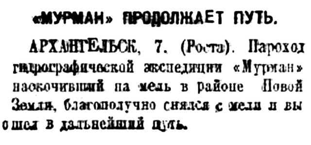 АРХАНГЕЛЬСК. 4. (Роста). Получено сообщение, что вышедший в гидрографическую экспедицию под руководством профессора Матусевича пароход «Мурман» потерпел аварию в районе Белушьей губы Новой Земли. Отправлены суда на помощь «Мурману».
