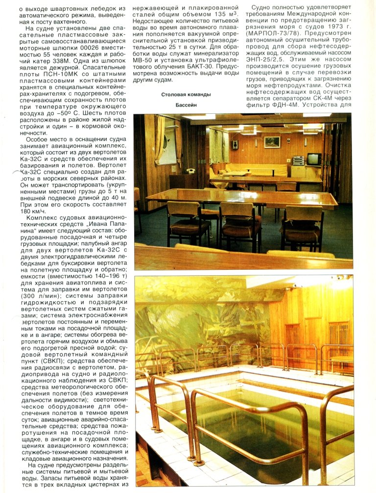 Комплекс судовых авиационно-техничоских средств „Ивана Папанина" имеет следующий состав: оборудованные посадочная и четыре грузовых площадки; палубный ангар для двух вертолетов Ка-32С с двумя электрогидравлическими лебедками для буксировки вертолета на полетную площадку и обратно: емкости (вместимостью 140-196 т) для хранения авиатоплива и система для заправки им вертолетов (300 л/мин): системы заправки гидрожидкостью и подзарядки вертолетных систем сжатыми газами; система электроснабжения вертолетов постоянным и переменным токами на посадочной площадке и в ангаре; системы обогрева вертолета горячим воздухом и обмыва его подогретой пресной водой; судовой вертолетный командный пункт (СВКП); средства обеспечения радиосвязи с вертолетом, радиопривода на судно и радиолокационного наблюдения из СВКП; средства метеорологического обеспечения полетов (без измерения дальности видимости); светотехническое оборудование для обеспечения полетов в темное время суток; авиационные аварийно-спасательные средства; средства пожаротушения на посадочной площадке, в ангаре и в судовых помещениях авиационного комплекса; служебно-технические помещения и кладовые авиационного назначения.