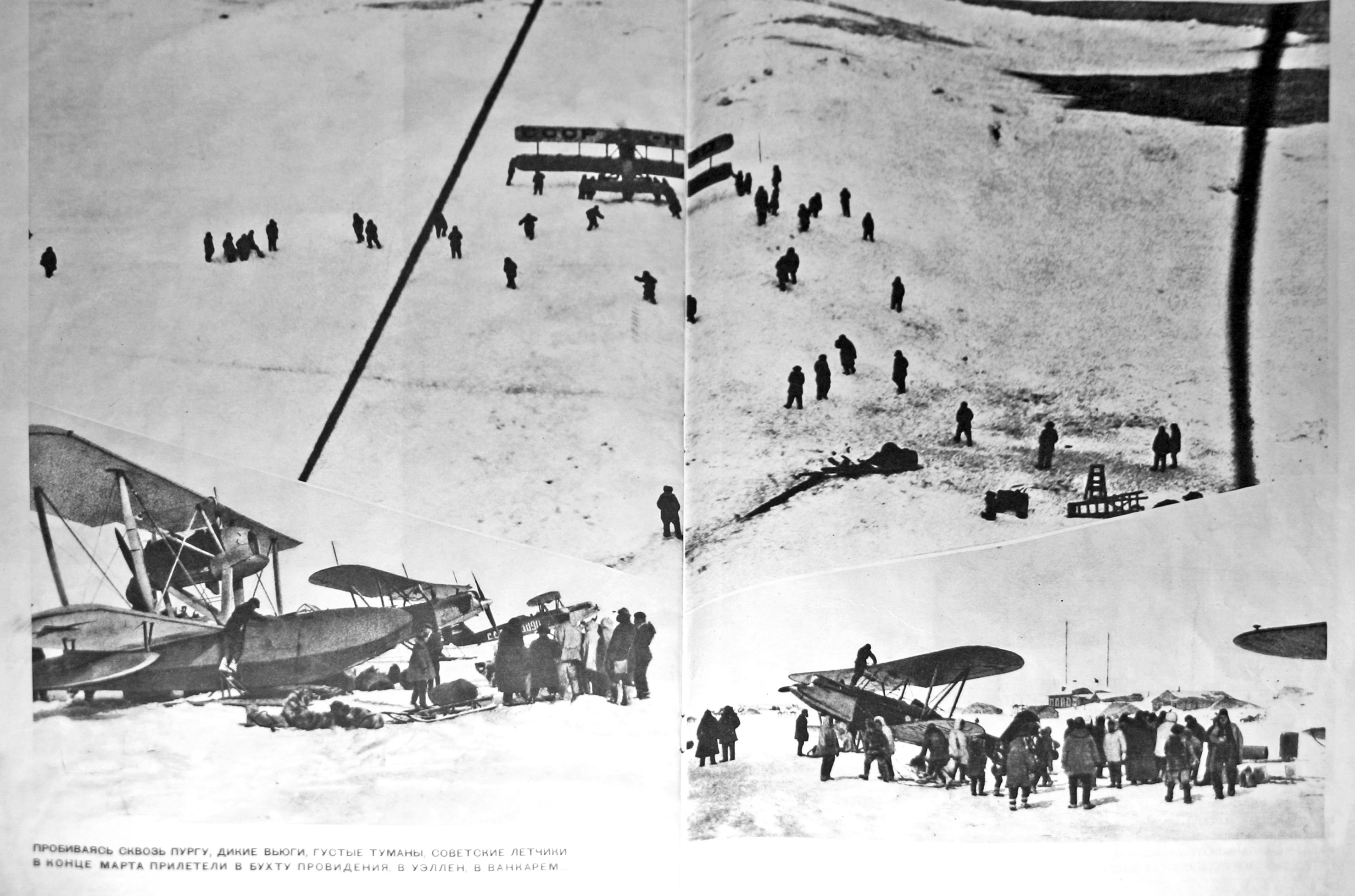 Подпись : "Пробиваясь сквозь пургу, дикие метели, густые туманы, советские летчики в конце марта прилетели в Бухту Провидения, в Уэллен, в Ванкарем"
