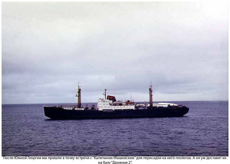 Я бы не начал разговор с этого вопроса, если б не знал, что Сергиенко с 1975 года работает в Антарктических экспедициях. Сначала ходил к берегам ледового континента старшим помощником, а последние два года дублером капитана Григория Матусевича, с которым я познакомился шестнадцать лет тому назад. В тот год, когда собирался в арктический рейс из Владивостока, ходили слухи о назначении Матусевича на «Капитан Готский», упоминалась и кандидатура Жеребятьева, одного из нынешних заместителей начальника Дальневосточного пароходства. Но перед самым отходом капитаном на «Готский» пришел другой человек. С Жеребятьевым мы позже не раз встречались во Владивостоке, он и сейчас находился где-то рядом, в Певеке, руководил Штабом морских операций. А вот с Матусевичем так и не довелось больше увидеться. Только знал, что он награжден орденом «Знак Почета». Но я хорошо запомнил этого доброжелательного человека с едва пробивающейся сединой. И когда накануне отхода «Мышевского» я случайно узнал, что капитан Сергиенко считает Григория Матусевича своим арктическим и антарктическим учителем, не скрою, в памяти возникла наша давняя встреча с ним, его рассказ, в котором сквозило желание воодушевить меня перед первой встречей с Арктикой.